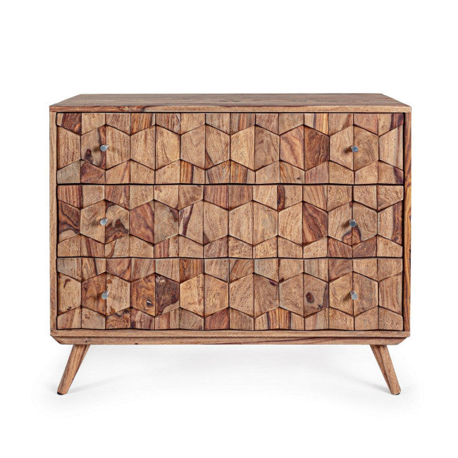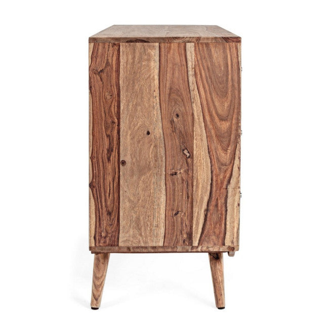 STRUTTURA IN LEGNO SHEESHAM, SCHIENALE E FONDO CASSETTI IN COMPENSATO. FINITURA NATURALE. POMELLI IN ACCIAIO. GAMBE DA ASSEMBLARE.