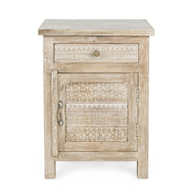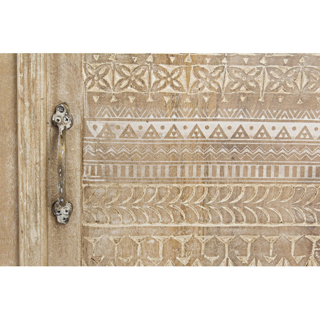 STRUTTURA IN LEGNO DI MANGO CON DECORAZIONI INTARSIATE A MANO, SCHIENALE E FONDO CASSETTI IN MDF. FINITURA A BASE DI NITROCELLULOSA. POMELLI E MANIGLIE IN OTTONE.