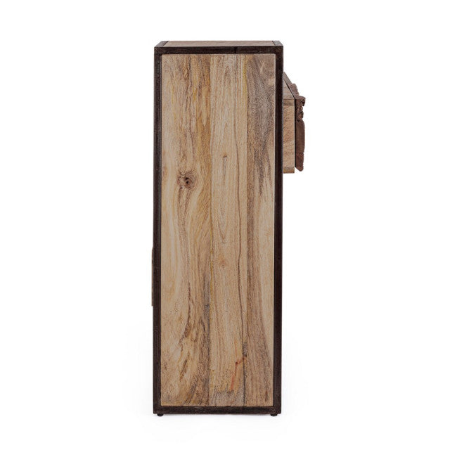 STRUTTURA IN LEGNO MANGO ED ACCIAIO, SCHIENALE IN COMPENSATO. FRONTALE ANTE E CASSETTI IN LEGNO RICICLATO O LAMINA DI ACCIAIO O FINITURA IN FIBRA DI CEMENTO. FINITURA ACRILICA PROTETTIVA. PIEDINI REGOLABILI. IL PRODOTTO IN LEGNO RICICLATO È CARATTERIZZATO DALLA PRESENZA DI TASSELLI IN LEGNO DI DIVERSE SPECIE E COLORE. EVENTUALI FESSURE, CREPE O IMPERFEZIONI, CHE POSSONO GENERARSI ANCHE NEL CORSO DEL TEMPO, SONO CARATTERISTICHE DI QUESTO MATERIALE E RENDONO OGNI PEZZO UNICO E ORIGINALE. DA ASSEMBLARE.