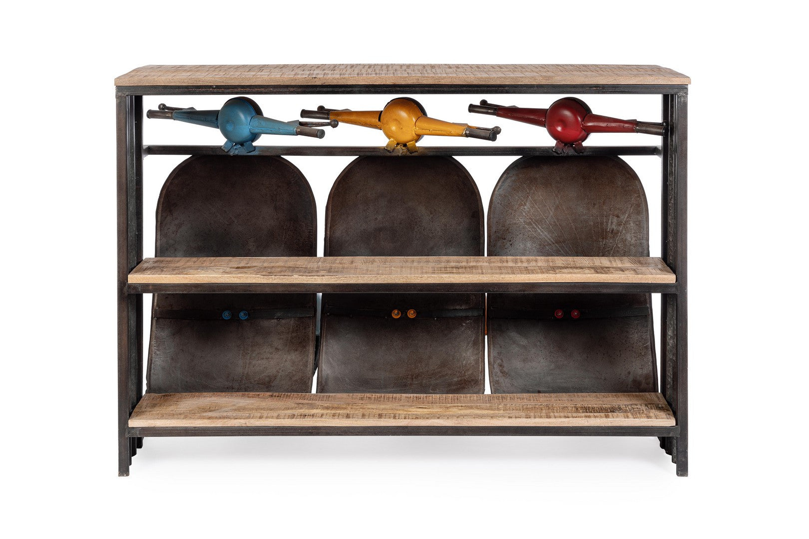 STRUTTURA IN ACCIAIO. PIANO IN LEGNO DI MANGO. TRATTANDOSI DI PRODUZIONE ARTIGIANALE OGNI MODELLO PUO' VARIARE IN PICCOLI PARTICOLARI COSTRUTTIVI. EVENTUALI PICCOLE CREPE O SPACCATURE SONO DA RITENERSI CARATTERISTICHE PROPRIE AL NATURALE LAVORO DI RECUPERO.