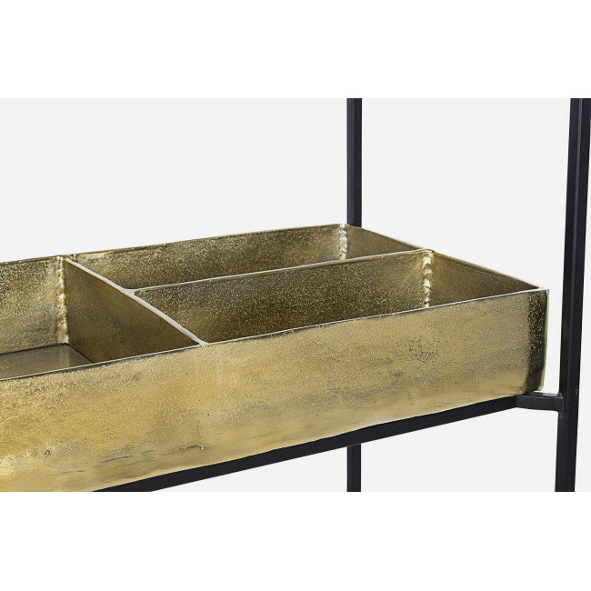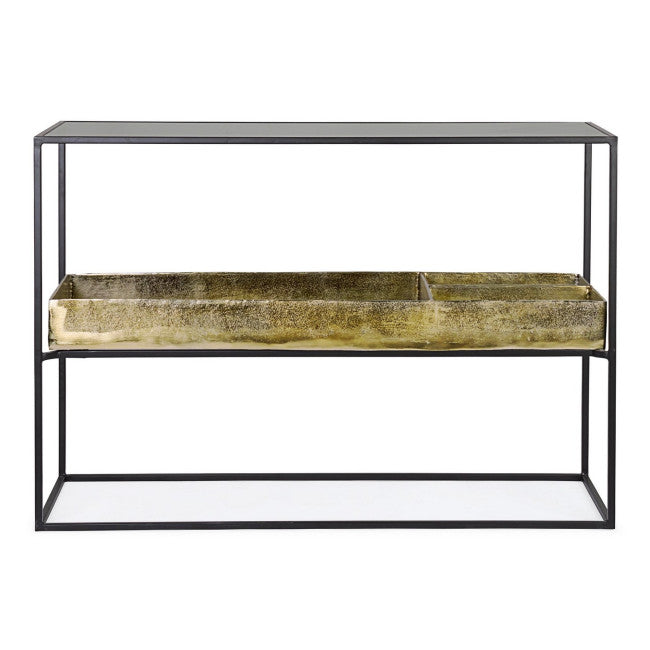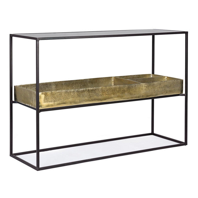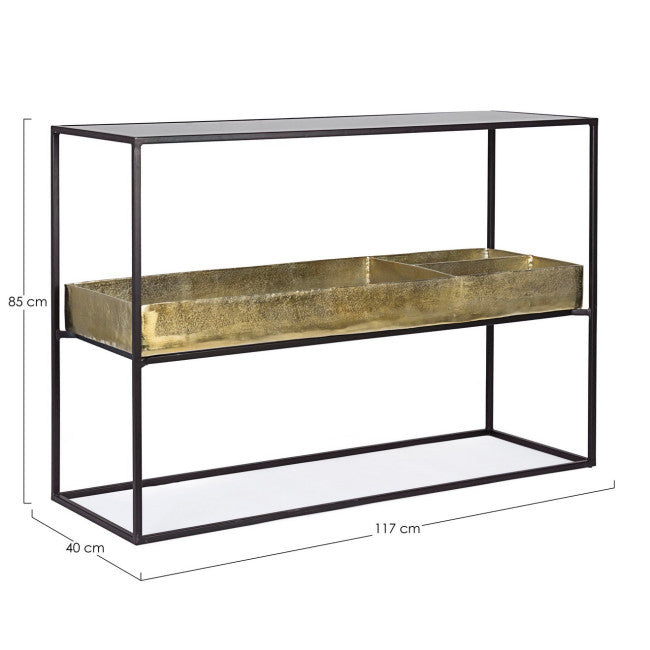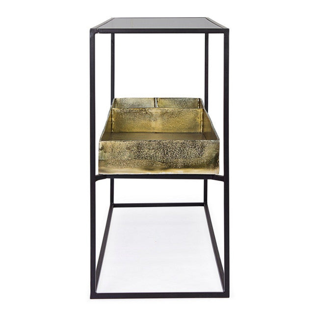 STRUTTURA IN ACCIAIO VERNICIATA A POLVERE EPOSSIDICA. PIANO SUPERIORE IN VETRO TEMPERATO. PIANO INFERIORE CON CONTENITORE IN ALLUMINIO CON FINITURA PLACCATA OTTONE ED ANTICATA.