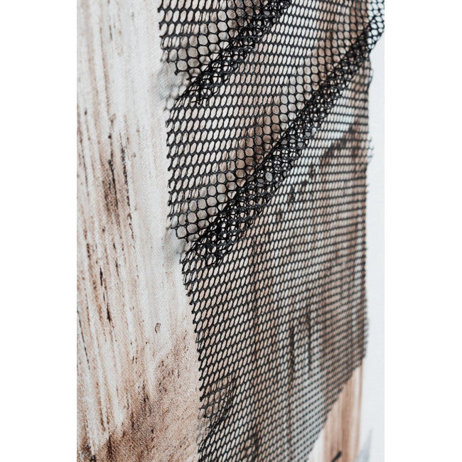 DIPINTO SU TELA CON APPLICAZIONI METALLICHE, STRUTTURA IN LEGNO DI ABETE. CORNICE IN PLASTICA.