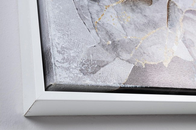 Stampa dipinta a mano su tela, struttura in legno di abete. Cornice in plastica. Misure 82.5x4.5x122.5
