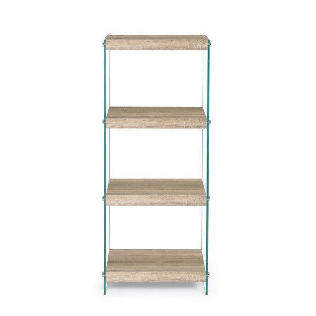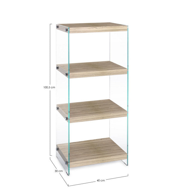 MENSOLE IN MDF RIVESTITE IN CARTA MELAMINICA EFFETTO LEGNO. FIANCHI IN VETRO TEMPERATO SPESSORE 12MM. DA ASSEMBLARE.