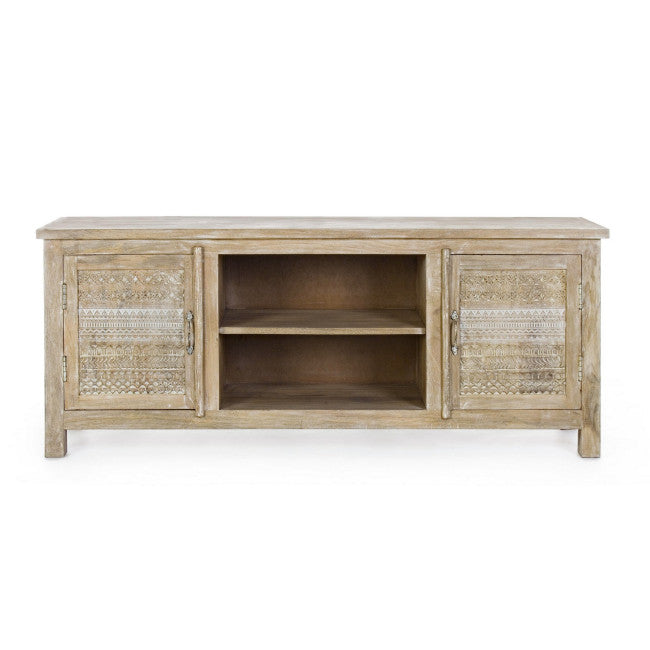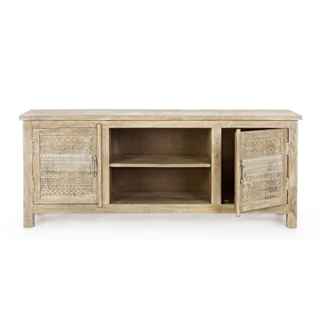 STRUTTURA IN LEGNO DI MANGO CON DECORAZIONI INTARSIATE A MANO, SCHIENALE IN MDF. FINITURA A BASE DI NITROCELLULOSA. MANIGLIE IN OTTONE.