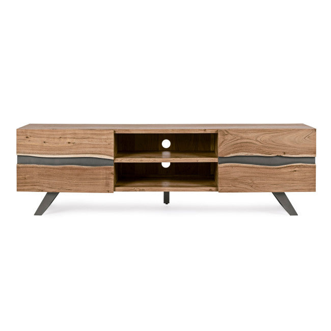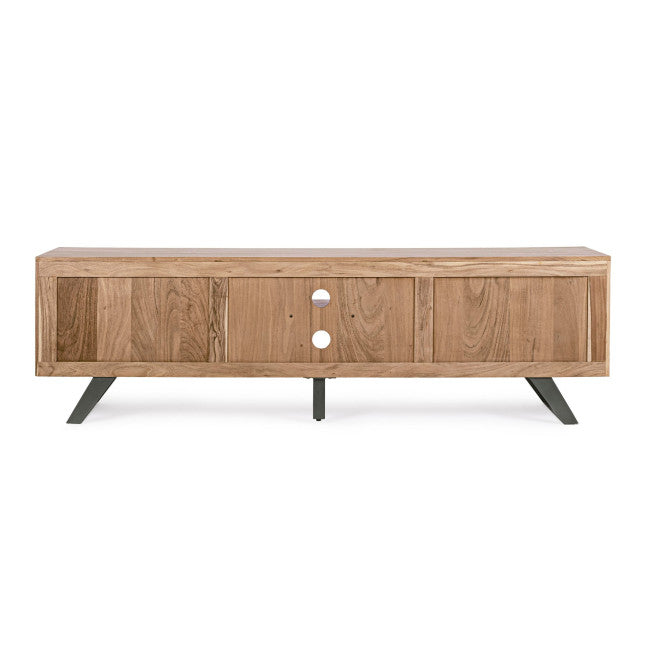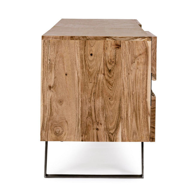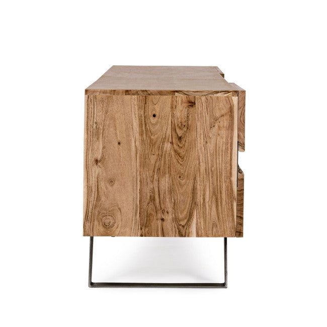 STRUTTURA IN LEGNO DI ACACIA, GAMBE IN ACCIAIO VERNICIATO A POLVERE EPOSSIDICA. PORTE CON INSERTI IN METALLO. FINITURA A BASE DI VERNICE POLIURETANICA. GAMBE DA ASSEMBLARE.