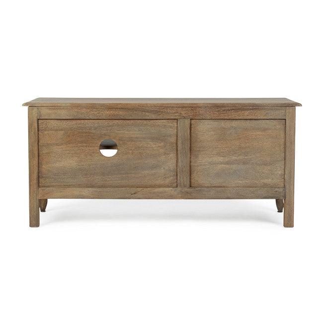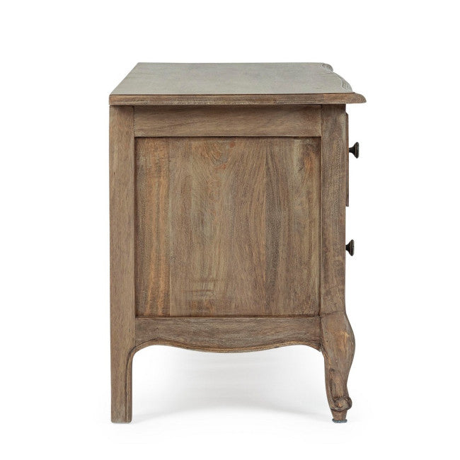 STRUTTURA IN LEGNO DI MANGO, SCHIENALE E FONDO CASSETTI IN MDF. FINITURA CON VERNICE A BASE D'ACQUA. MANIGLIE IN GHISA.