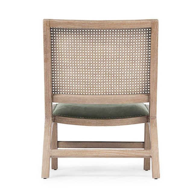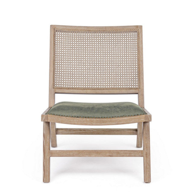 STRUTTURA IN LEGNO DI FRASSINO CON FINITURA A BASE DI NITROCELLULOSA, SCHIENALE CON INTRECCIO IN RATTAN. RIVESTIMENTO SEDUTA IN POLIESTERE CON APPLICAZIONE DI BORCHIE IN METALLO. IMBOTTITURA IN SCHIUMA POLIURETANICA DENSITA' SEDUTA 30KG/M3.