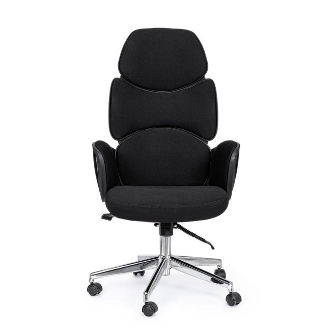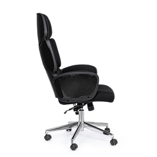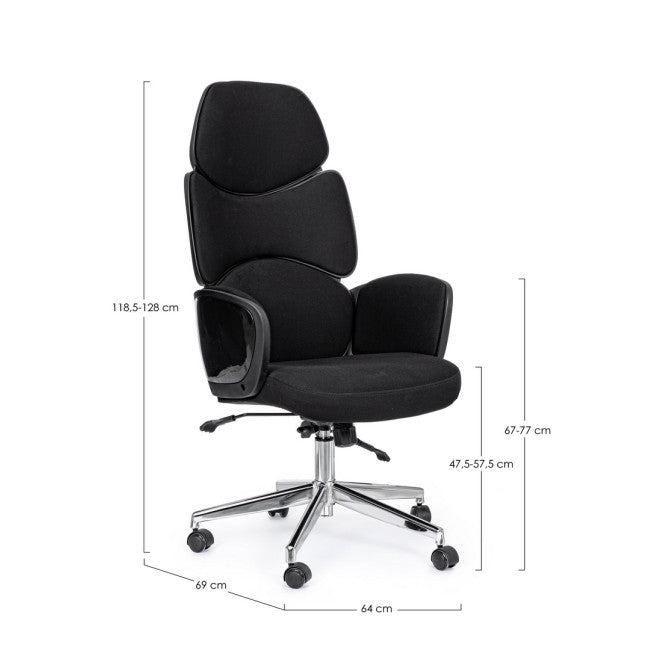 BASE IN ACCIAIO CROMATO Ø65 CM. RUOTE IN PU. IMBOTITURA IN SCHIUMA POLIURETANICA DENSITA' 24 KG/M3. RIVESTIMENTO IN TESSUTO 100% POLIESTERE. SCOCCA E BRACCIOLI IN PLASTICA (PP). MECCANISMO MULTIFUNZIONE: REGOLAZIONE DELL'ALTEZZA CON PISTONE A GAS E FUNZIONE SINCRONIZZATA DI RECLINAZIONE (BLOCCAGGIO SCHIENALE NELLA POSIZIONE DESIDERATA). CAPACITA' MAX DI CARICO: 150KG. DA ASSEMBLARE.