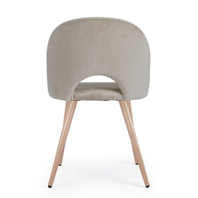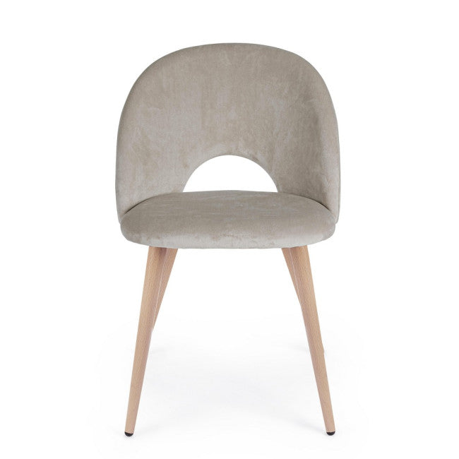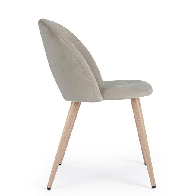 GAMBE IN ACCIAIO VERNICIATE EFFETTO LEGNO NATURALE. STRUTTURA IN COMPENSATO. IMBOTTITURA IN SCHIUMA POLIURETANICA. RIVESTIMENTO IN VELLUTO (100% POLIESTERE). GAMBE DA ASSEMBLARE.
