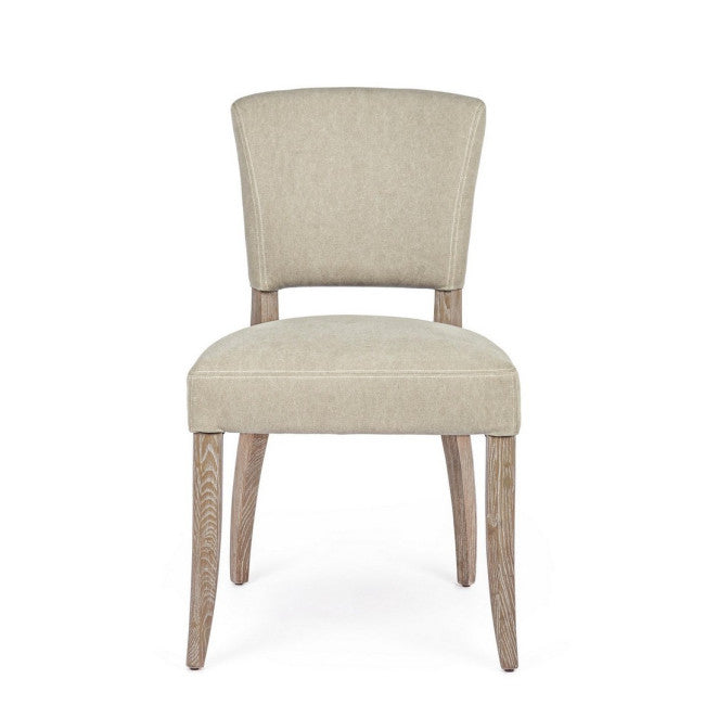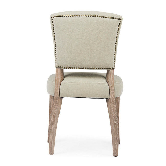 STRUTTURA IN LEGNO DI FRASSINO CON FINITURA A BASE DI NITROCELLULOSA, RIVESTIMENTO IN TESSUTO (15% POLIESTERE 85% COTONE). SCHIENALE CON APPLICAZIONE DI BORCHIE IN METALLO. IMBOTTITURA IN SCHIUMA POLIURETANICA DENSITA' SEDUTA 30KG/M3, SCHIENALE 25KG/M3.