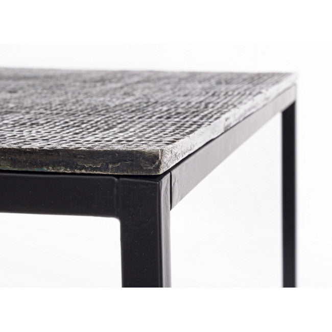 STRUTTURA IN ACCIAIO VERNICIATA A POLVERE EPOSSIDICA. PIANO IN ALLUMINIO CON FINITURA PLACCATA ED ANTICATA.
