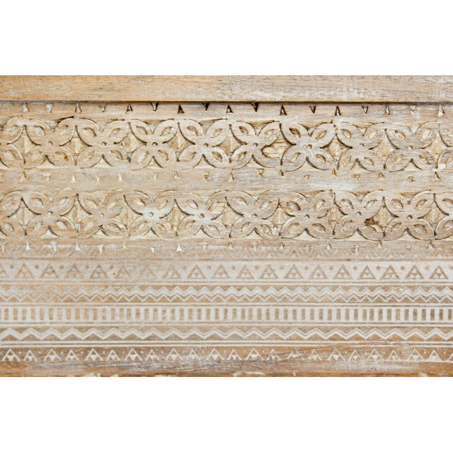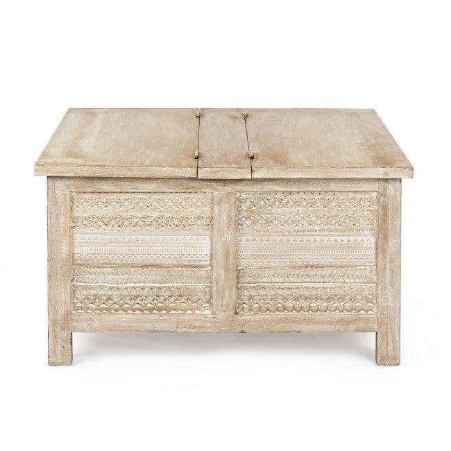 LEGNO DI MANGO CON DECORAZIONI INTARSIATE A MANO E PIANO APRIBILE. FINITURA A BASE DI NITROCELLULOSA.