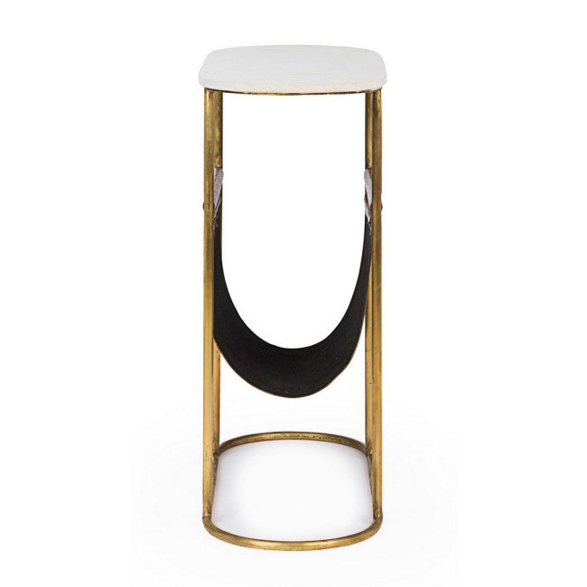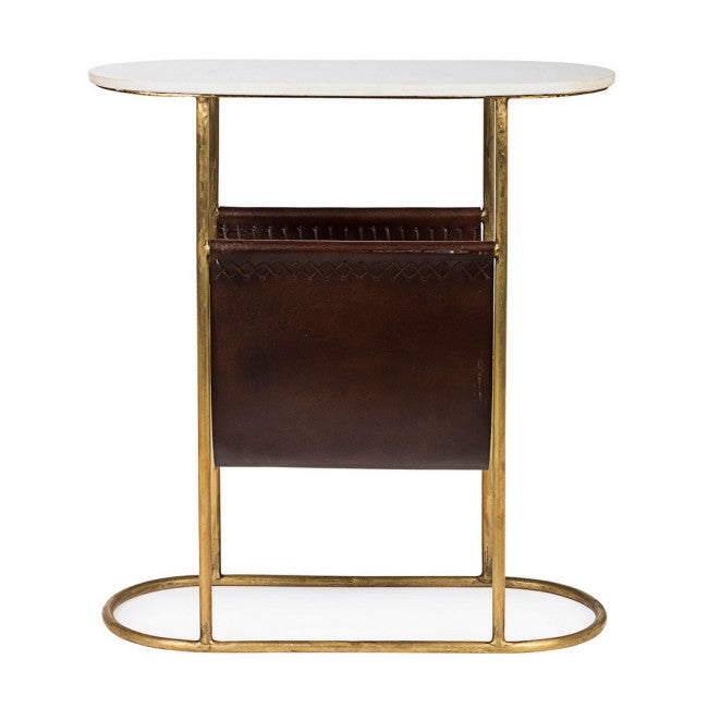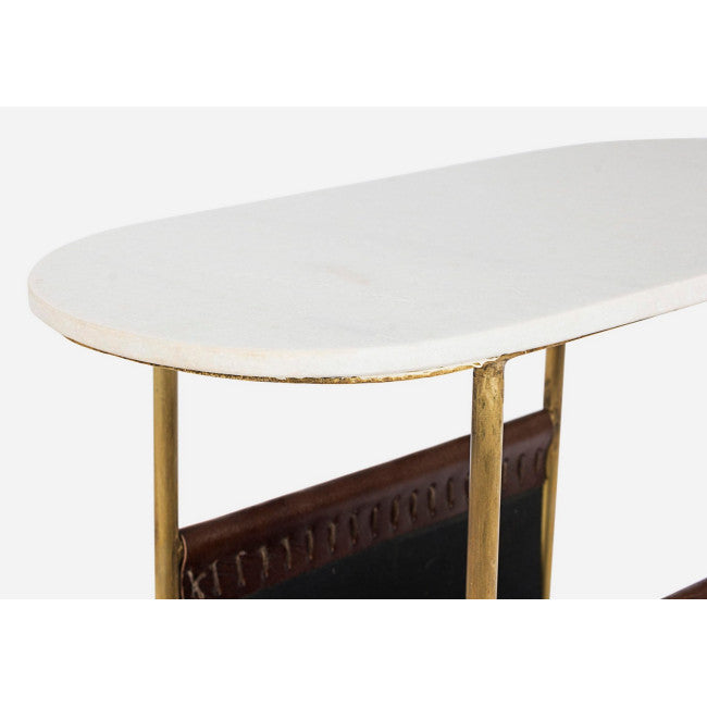 STRUTTURA IN ACCIAIO CON FINITURA OTTONATA. PIANO IN MARMO. PORTA RIVISTE IN VERA PELLE.