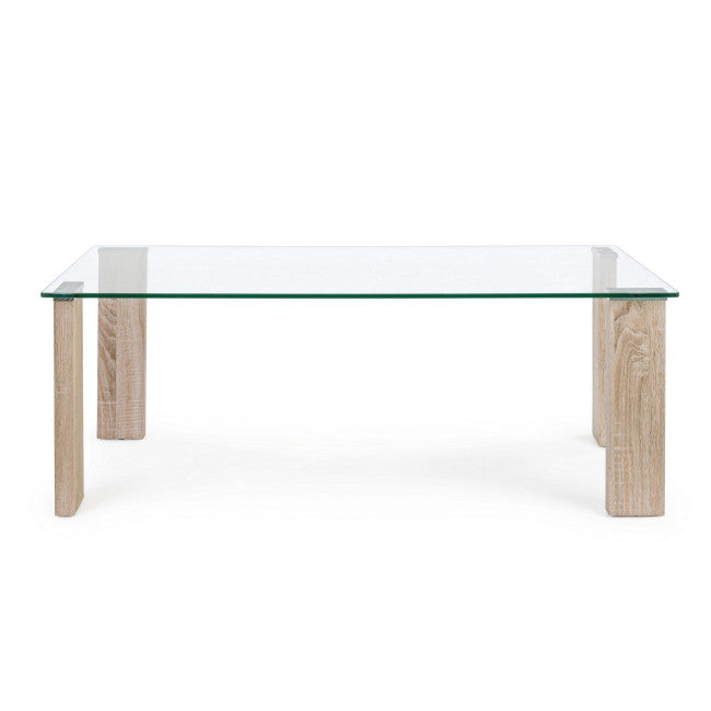 GAMBE IN MDF RIVESTITO IN CARTA MELAMINICA EFFETTO LEGNO. VETRO IN VETRO TEMPERATO SPESSORE 12MM. GAMBE DA ASSEMBLARE.