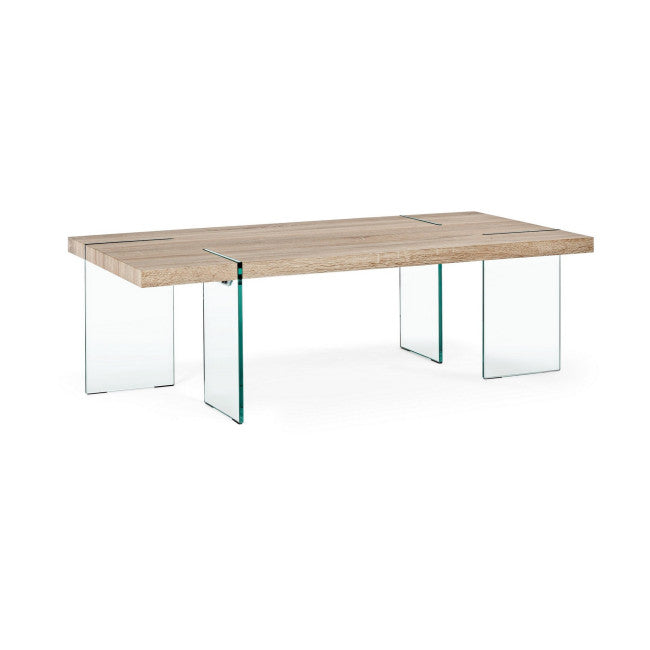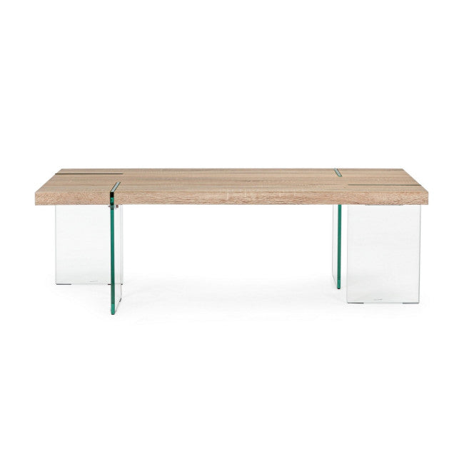GAMBE IN VETRO TEMPERATO TRASPARENTE SP 12MM. PIANO IN MDF RIVESTITO CON CARTA MELAMINICA EFFETTO LEGNO. GAMBE DA ASSEMBLARE.
