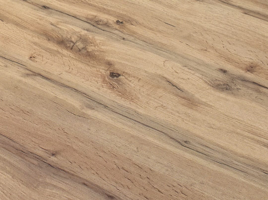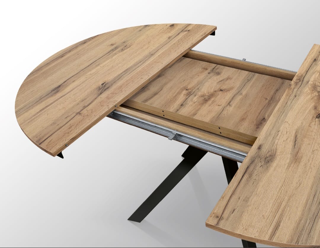 Tavolo allungabile con base in metallo colore nero, piano rotondo in nobilitato finitura rovere rustico 1 allunga cm 50
