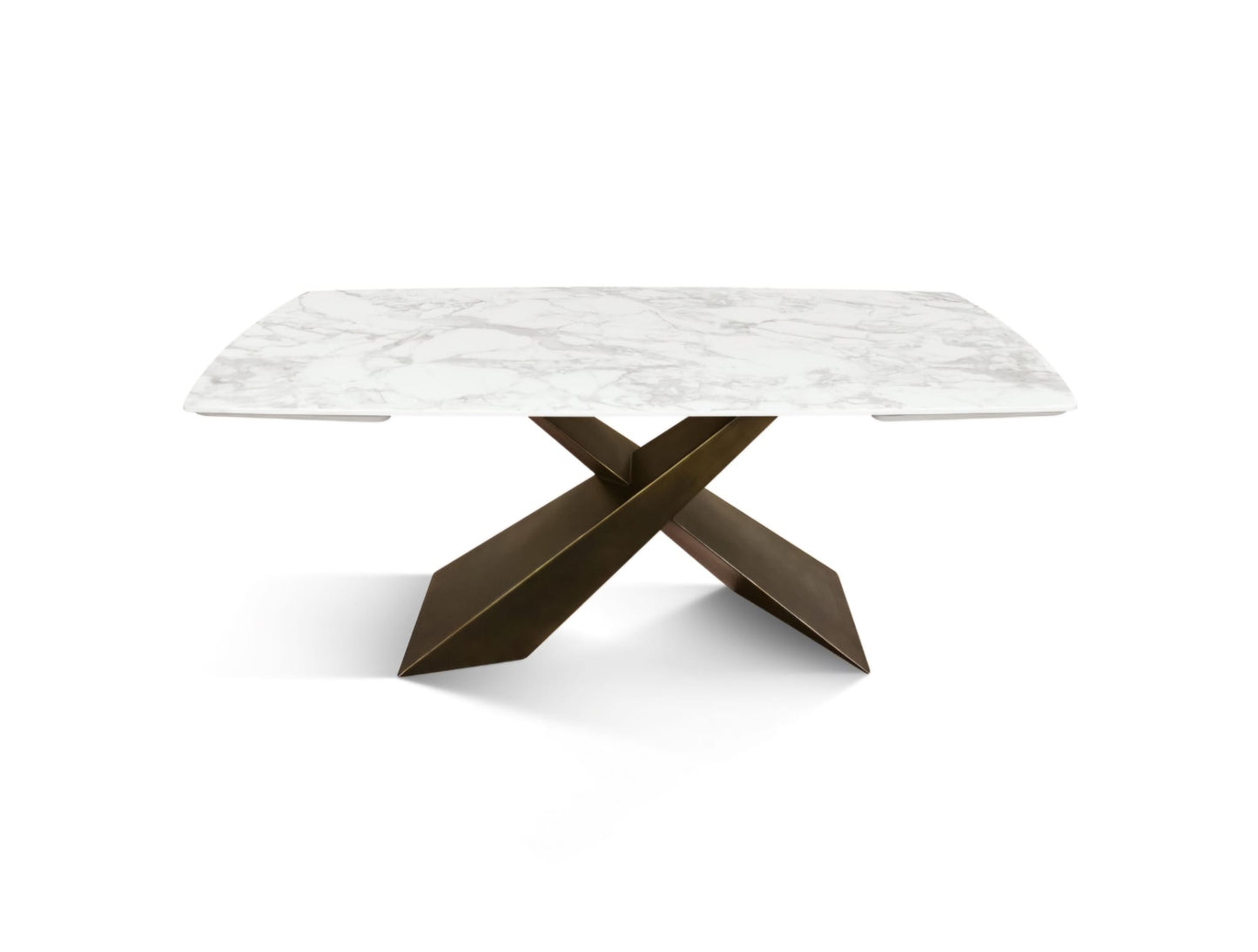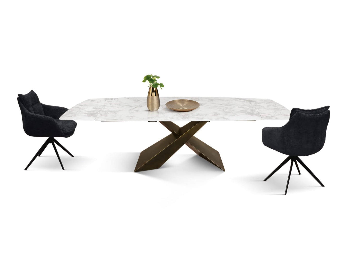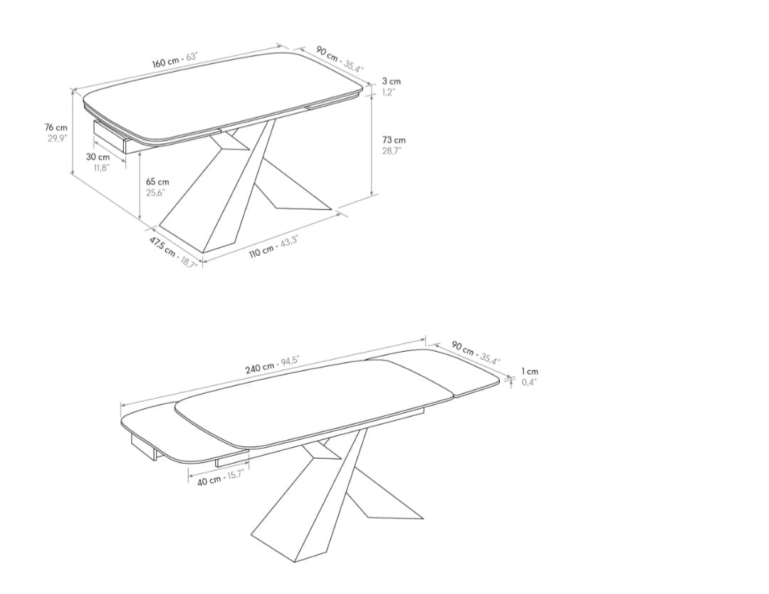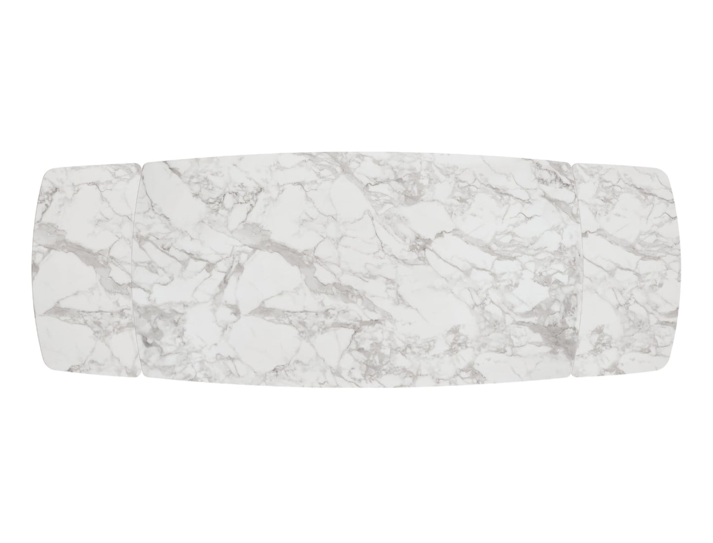 Tavolo allungabile con base in metallo colore bronzo, piano arrotondato in ceramica opaco finitura bianco arabesco con 2 allunghe cm 40. Misura chiuso cm L 160 P 90 H 76 , misura aperto cm L 240 P 90 H 76
