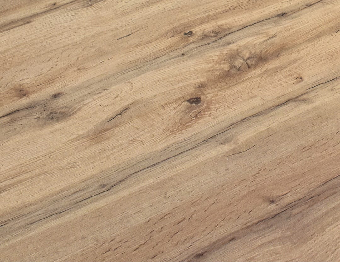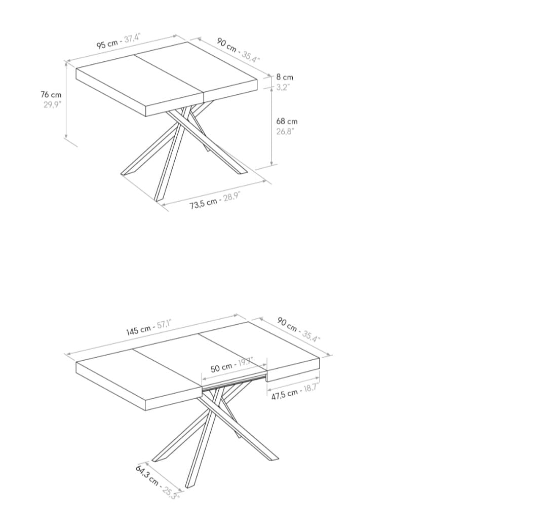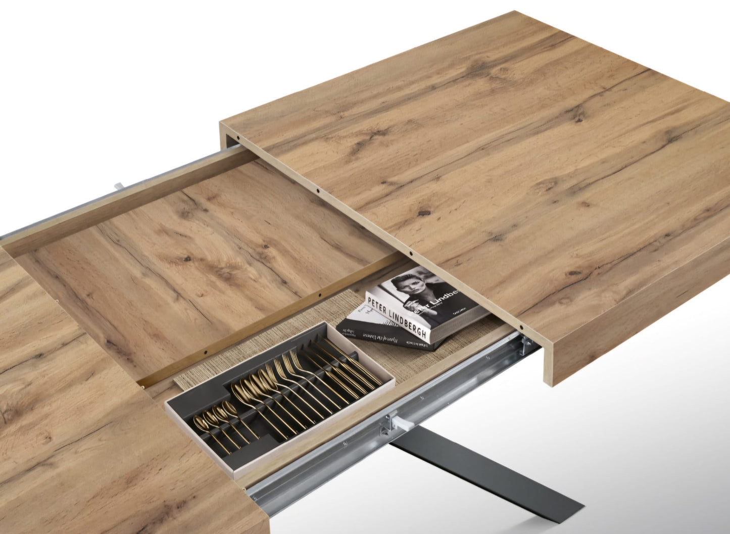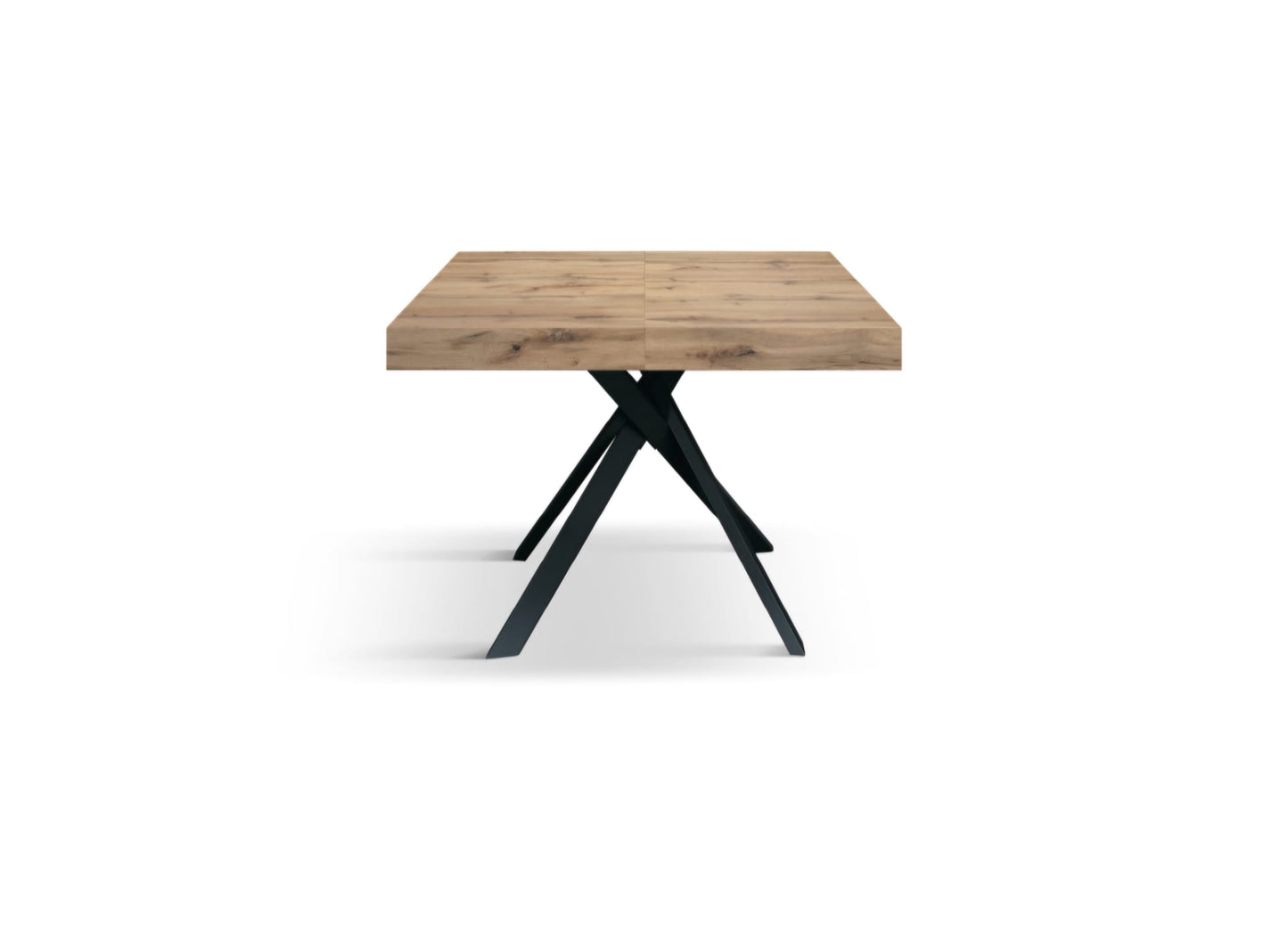 Tavolo allungabile con base in metallo colore nero, piano in nobilitato finitura rovere rustico 1 allunga cm 50