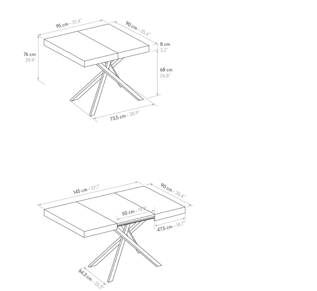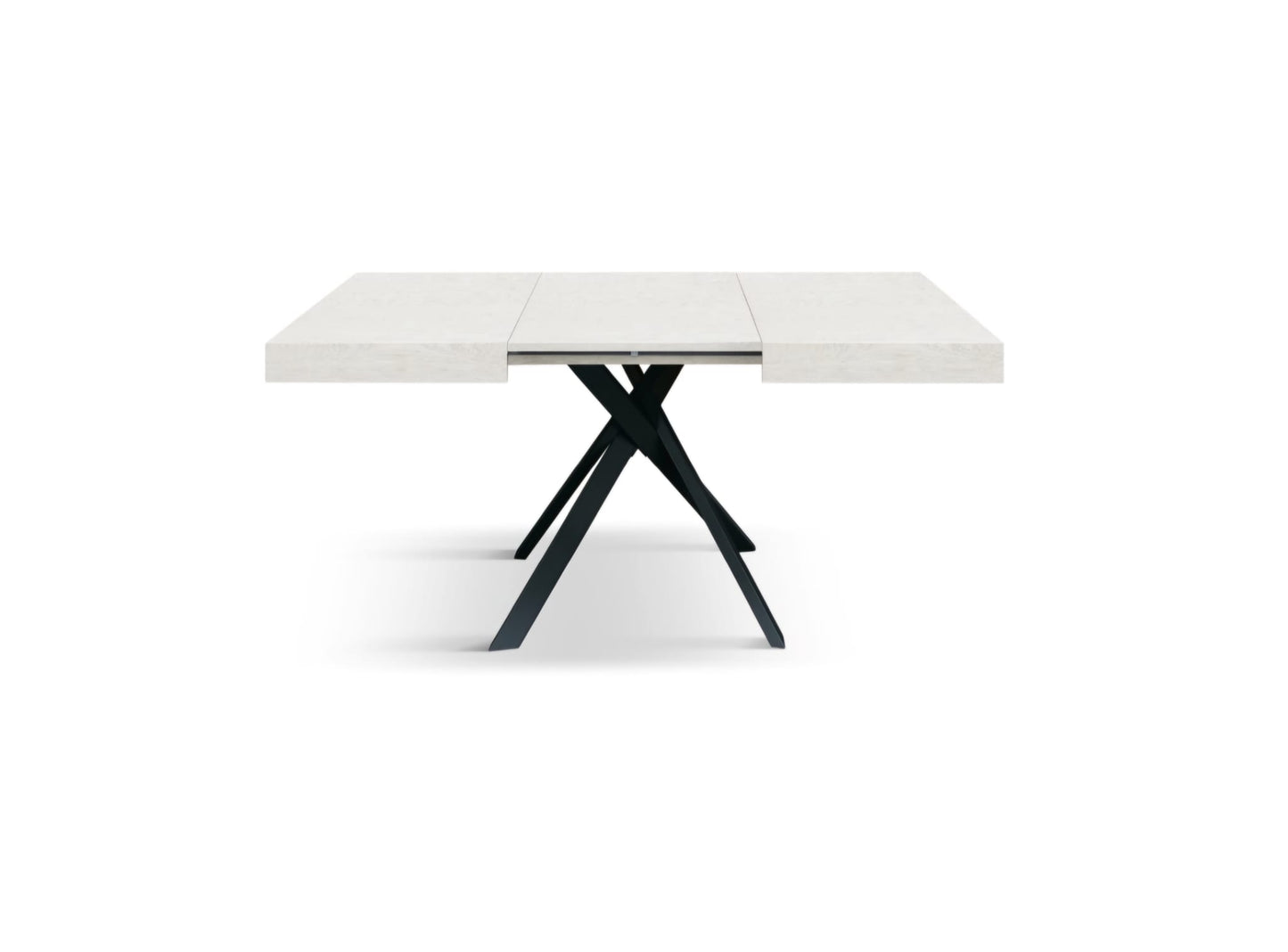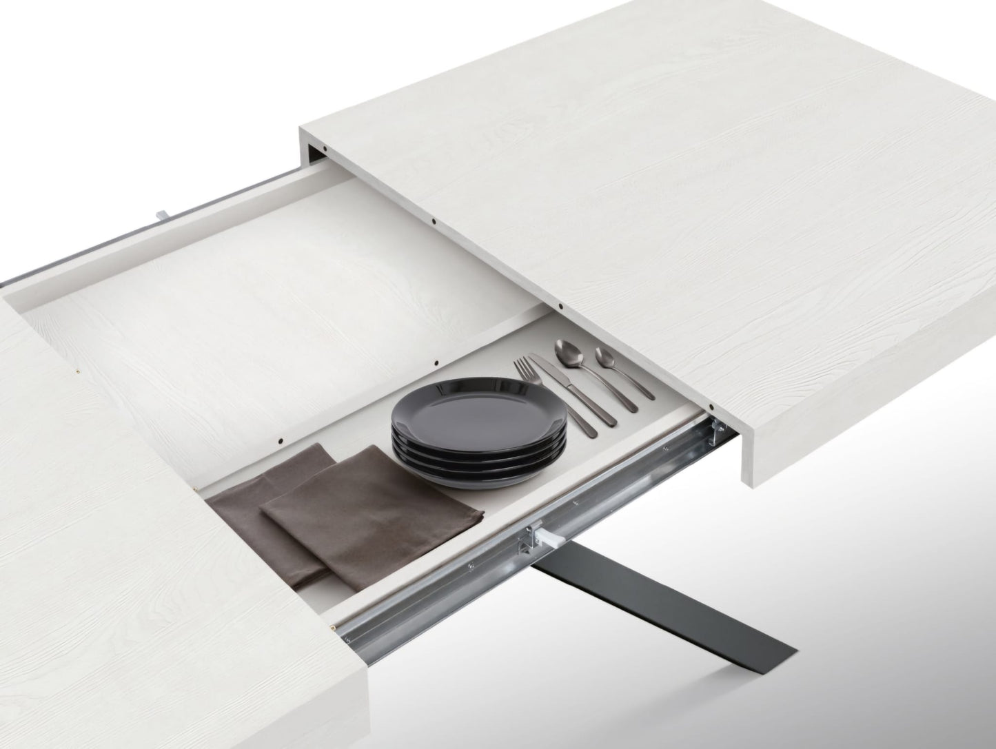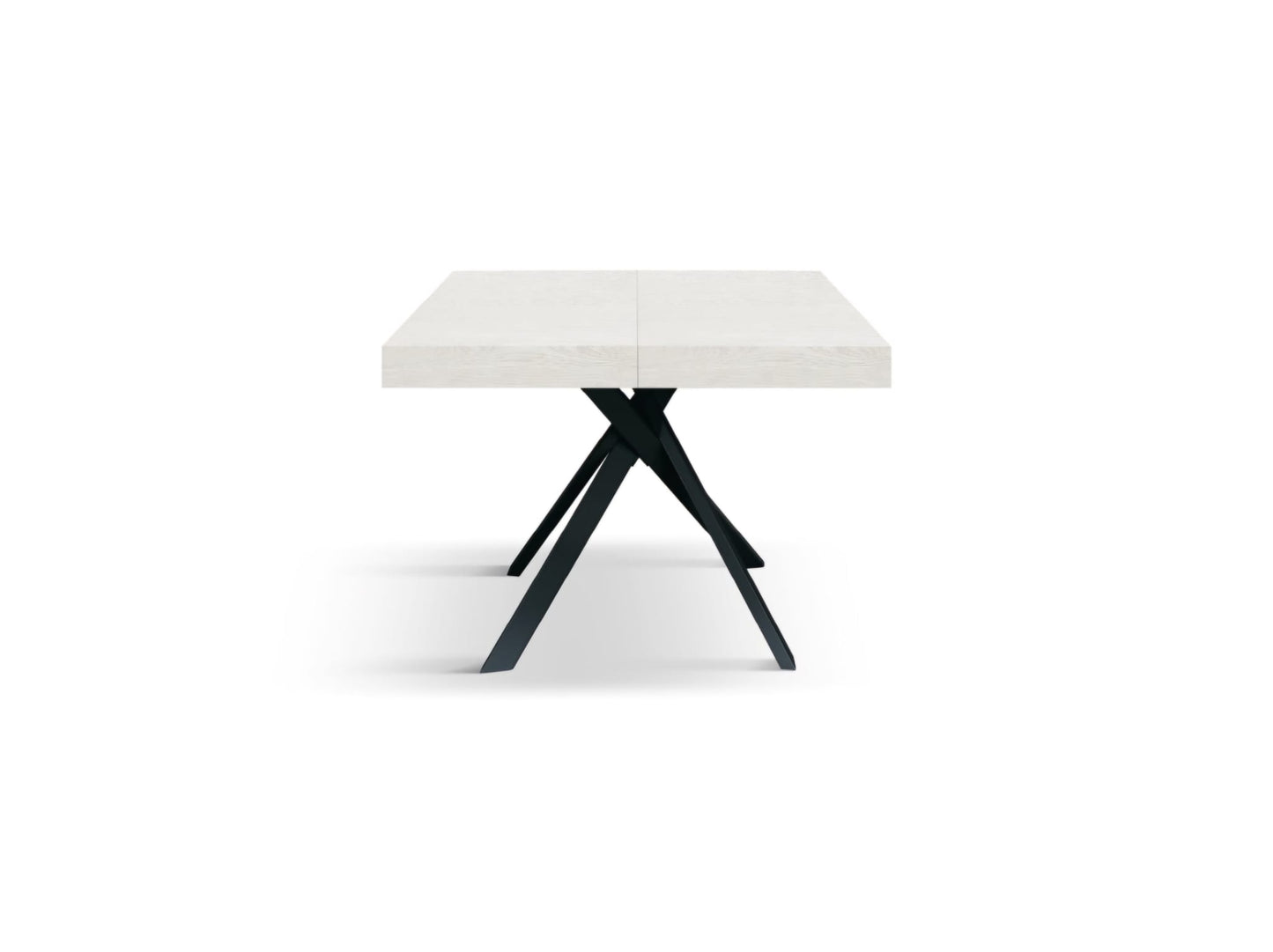 Tavolo allungabile con base in metallo colore nero, piano in nobilitato finitura bianco frassinato 1 allunga cm 50.