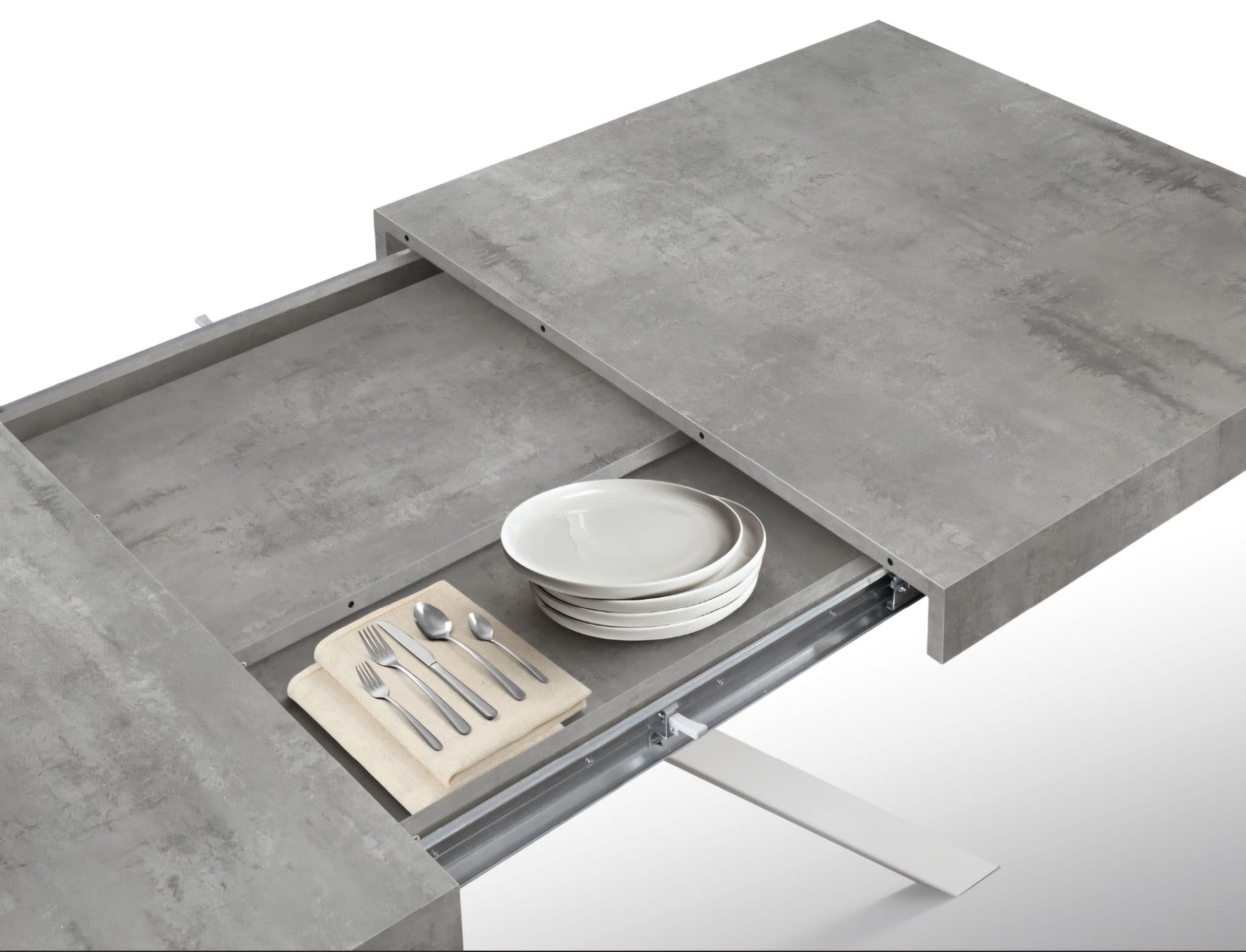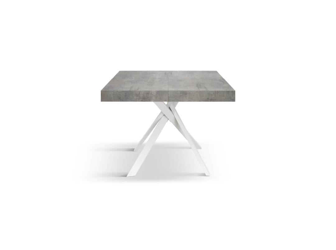 Tavolo allungabile con base in metallo colore bianco, piano in nobilitato finitura grigio cemento 1 allunga cm 50