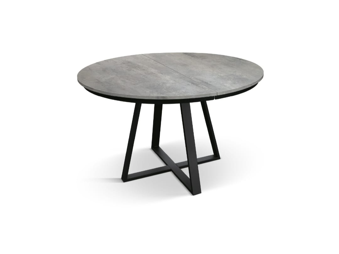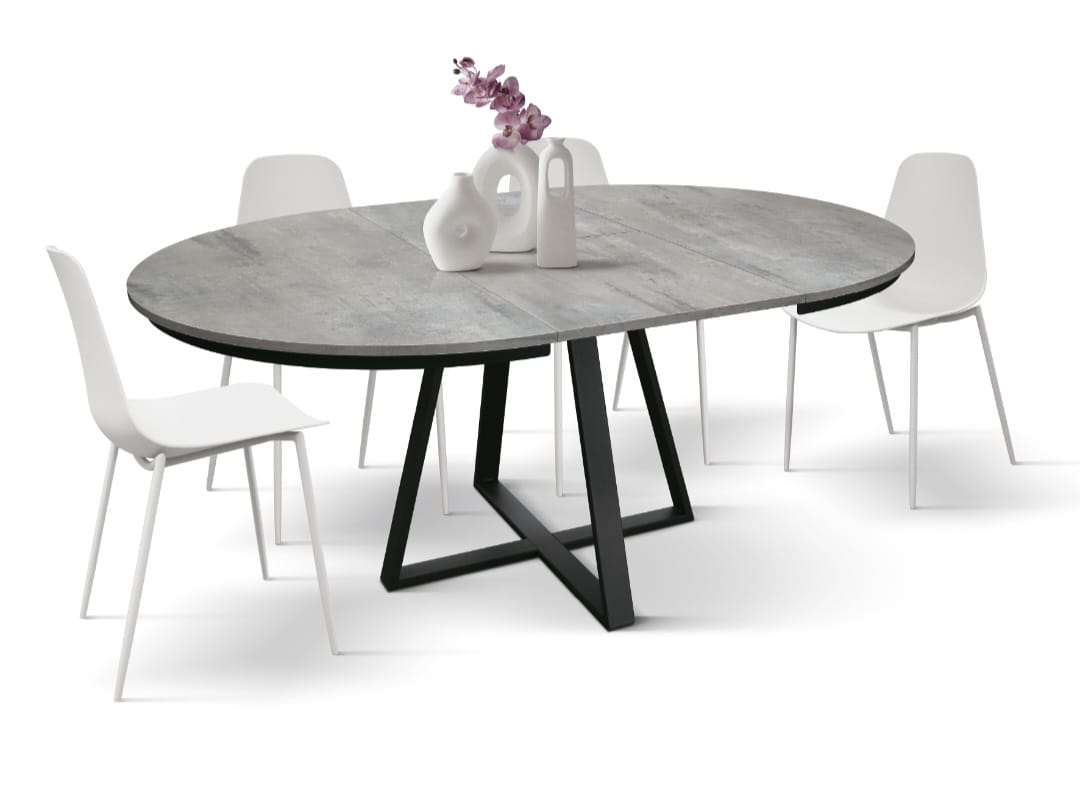 Tavolo allungabile con base in metallo colore nero, piano rotondo in nobilitato finitura grigio cemento, 1 allunga cm 50