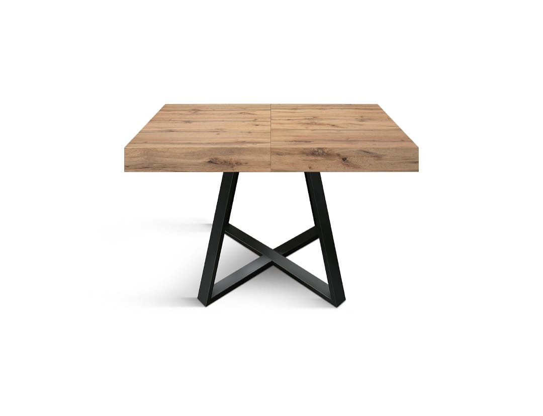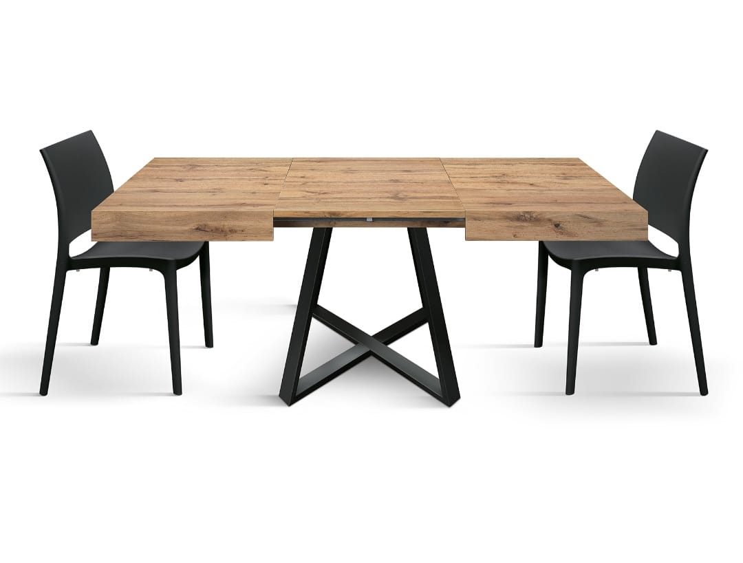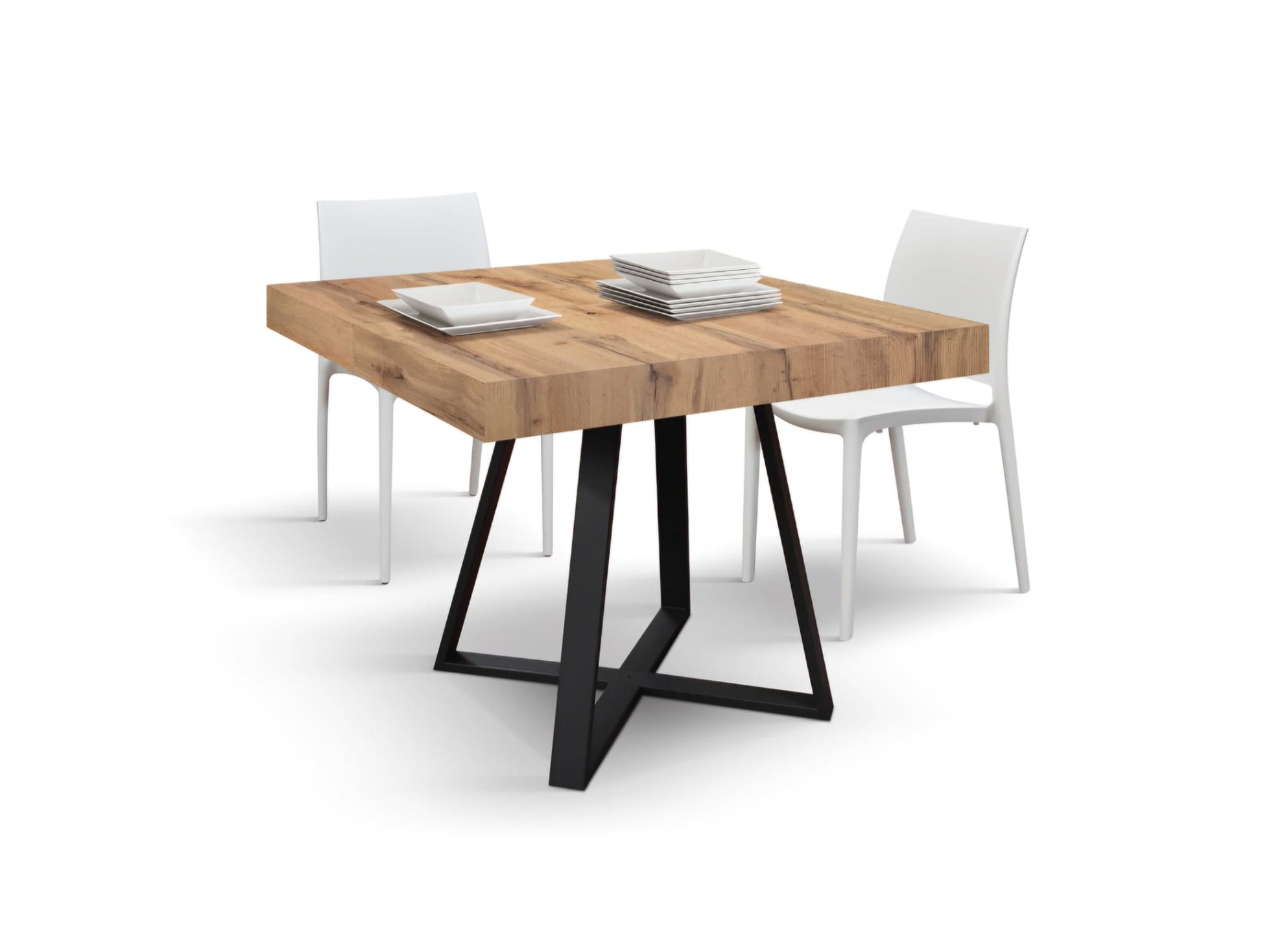 Tavolo allungabile con base in metallo colore nero, piano in nobilitato finitura rovere rustico, 1 allunga cm 50. Misura chiuso cm L 95 P 90 H 75.5 misure aperto cm L 145 P 90 H 75.5