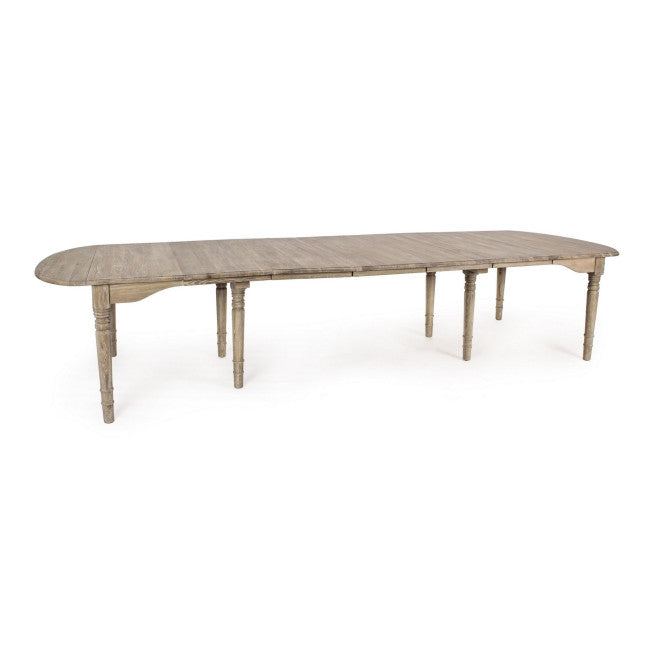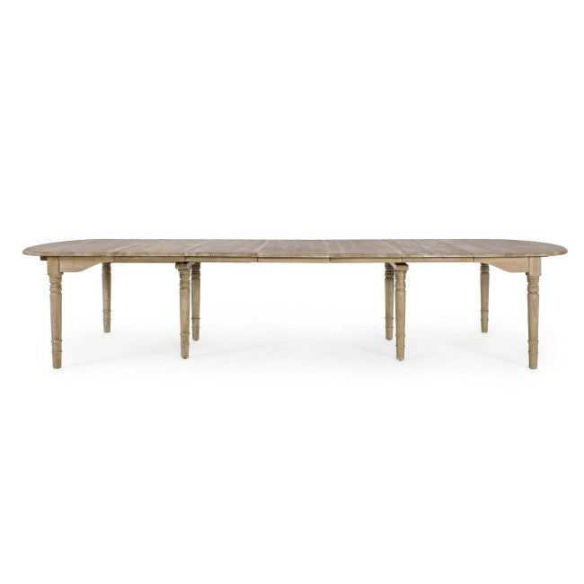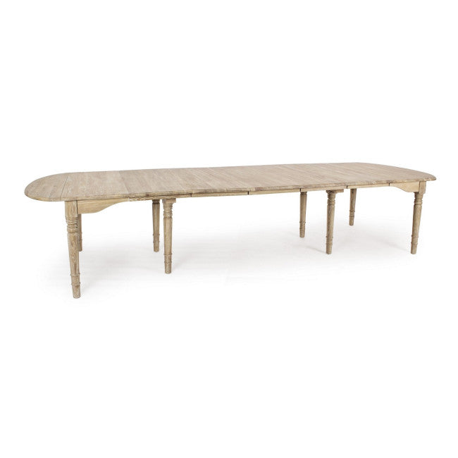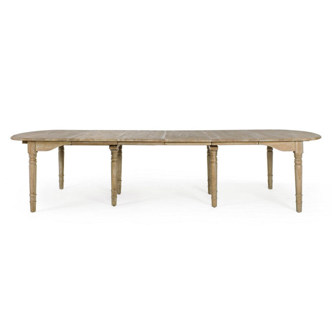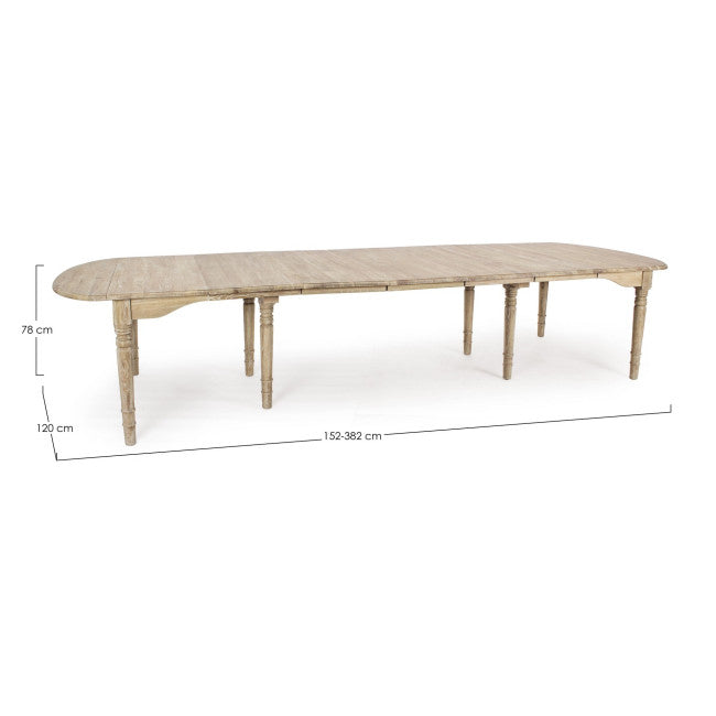 LEGNO MASSICCIO DI QUERCIA, VERNICIATURA A BASE D'ACQUA CON FINITURA INVECCHIATA E CERATA. 92X120 COMPLETAMENTE CHIUSO. 152X120 CON LATI OVALI APERTI. 382X120 APERTURA TOTALE. 5 PROLUNGHE DA 46CM ESTERNE . DA ASSEMBLARE.