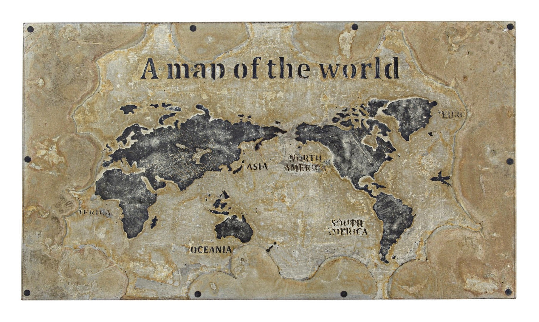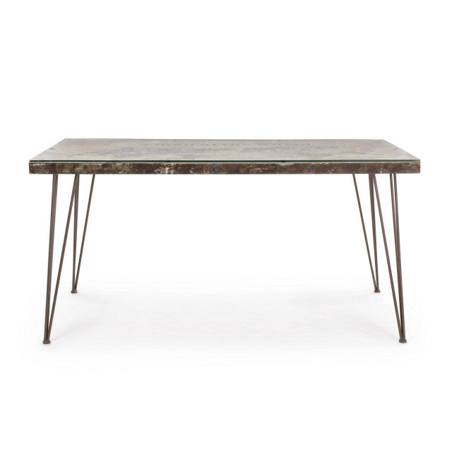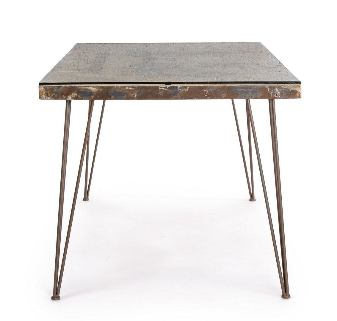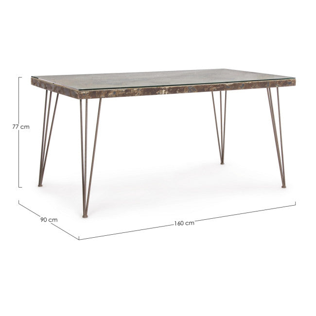 STRUTTURA IN ACCIAIO ANTICATO, PIANO IN VETRO E MDF CON DECORAZIONE IN CEMENTO. GAMBE DA ASSEMBLARE.